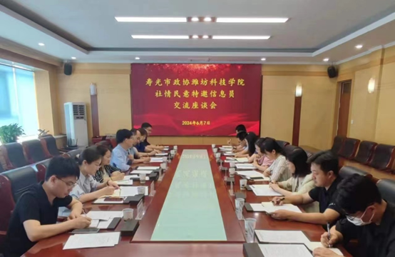 6月7日,寿光市政协潍坊科技学院社情民意特邀信息员交流座谈会在潍坊科技学院举行。潍坊科技学院党委委员、副校长张友祥,寿光市政协办公室副主任王耀坤,政协委员张青、付炳伟,寿光市政协办公室科员李承轩,我校科研处、二级学院科研负责人及博士代表参加座谈会。