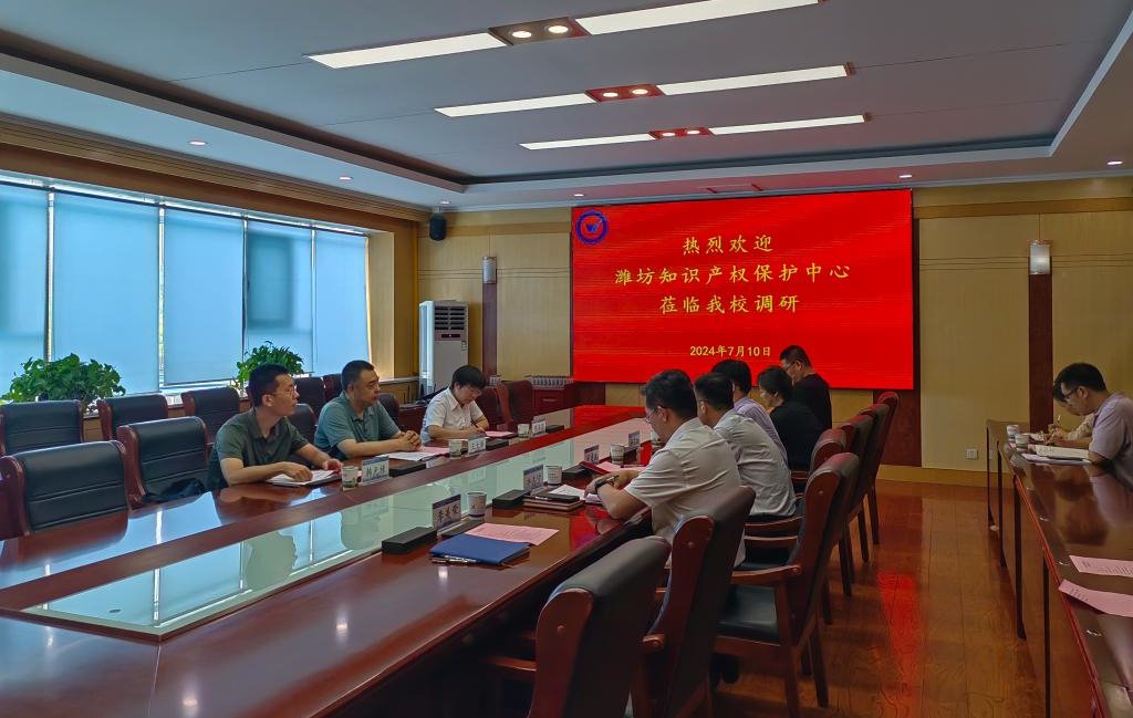 7月10日上午,潍坊市知识产权保护中心主任王大海、寿光市市场监督管理局党组成员、二级主办董建波一行4人到我校调研专利预审及科技成果转化工作情况。我校党委委员、副校长张友祥,科研处处长兼经济管理学院院长牛志宁等人参加座谈。