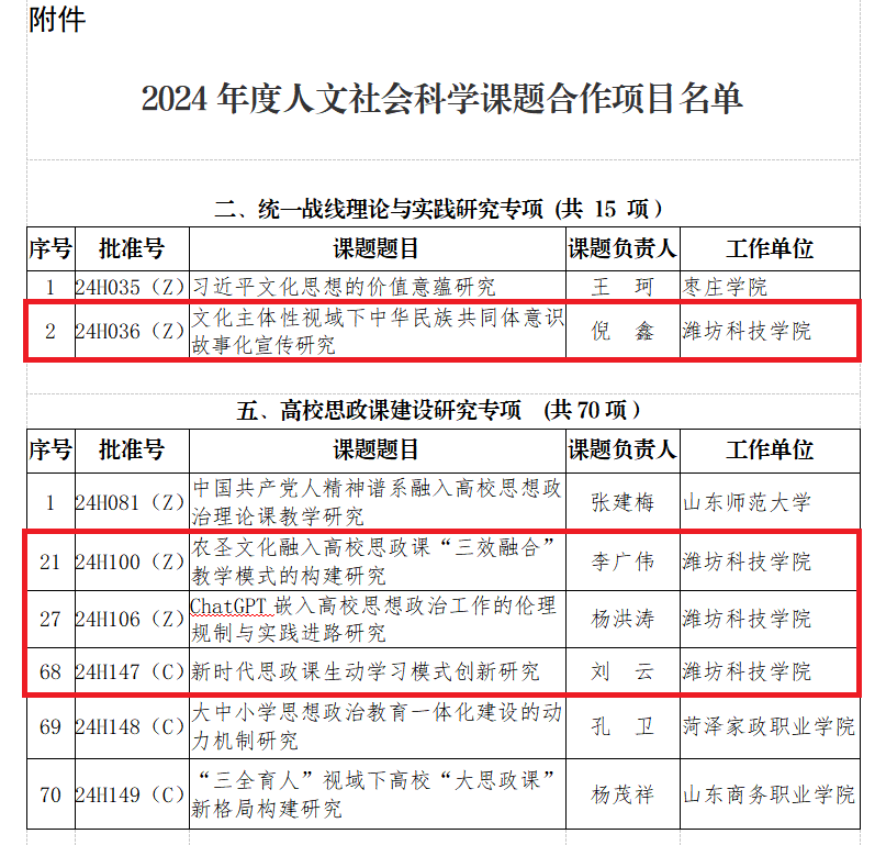 近日,山东省社会科学界联合会发布了《山东省社会科学界联合会2024年度人文社会科学课题合作项目名单》,我校4项课题获准立项。