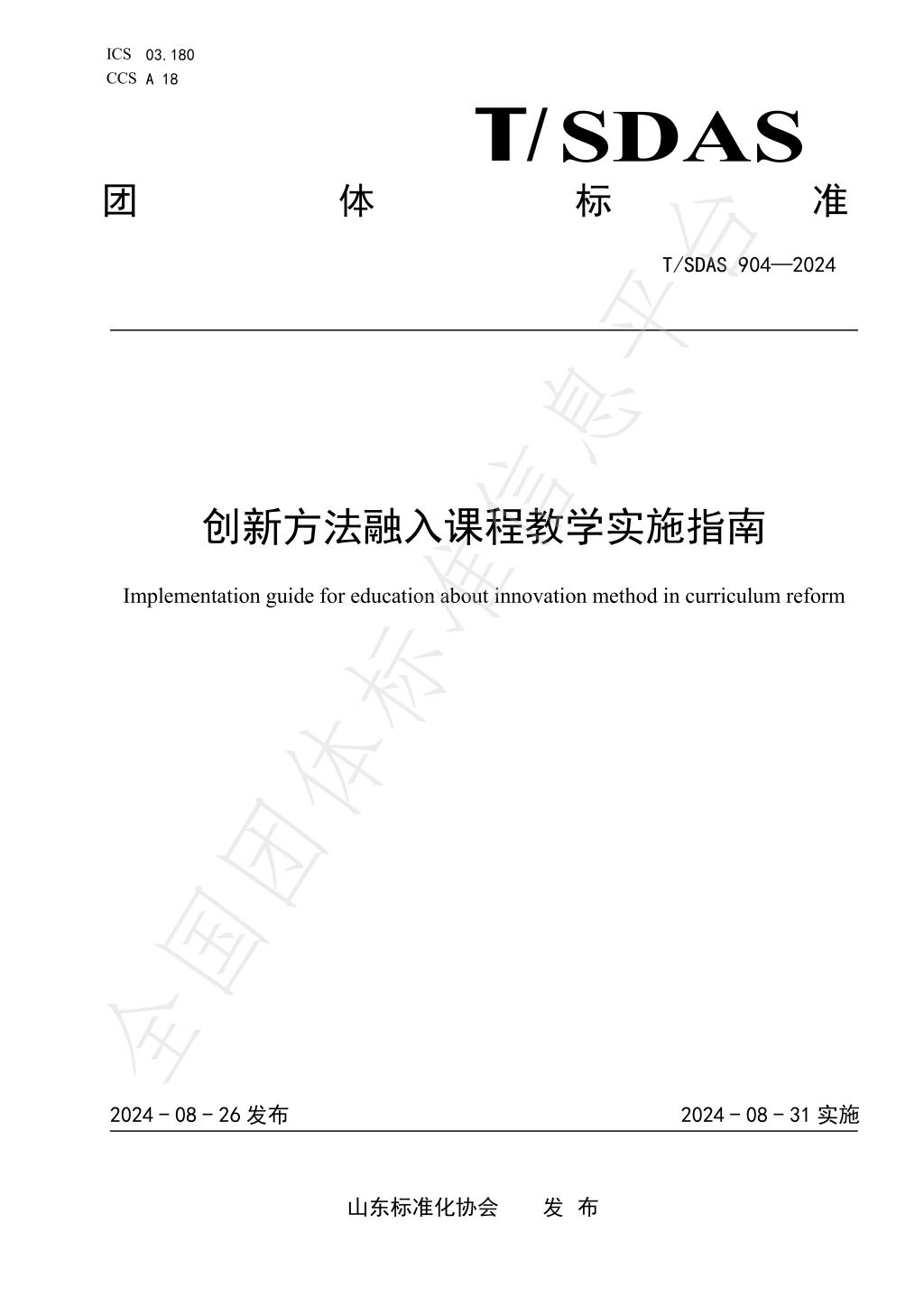 近日,我校参与制定的《创新方法融入课程教学实施指南》(T/SDAS 904-2024)、《创新方法融入课程教学实施能力等级划分要求》(T/SDAS 905-2024)两项团体标准,由山东标准化协会发布且正式实施。