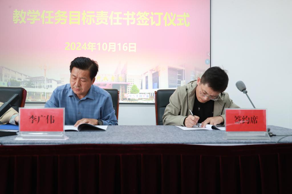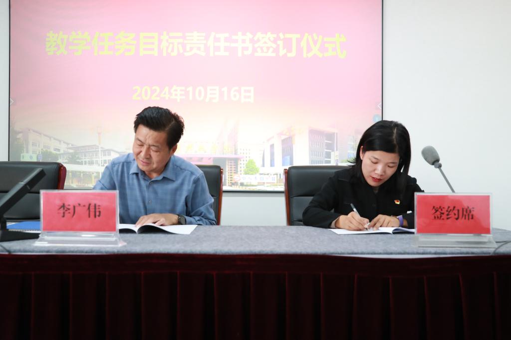 李广伟与各二级单位负责人签订了教学任务目标责任书,经济管理学院院长丁莹莹代表二级单位作了表态发言。李广伟结合学校发展实际,就如何开展教学项目培育、凝心聚力做好教学工作提出了七点要求:一是明确任务目标,坚定工作信心;二是紧盯核心指标,实施精准发力;三是强化课程建设,提升教学质量;四是加强团队建设,提升育人水平;五是重视学科竞赛,提升实践能力;六是助力学业提升,实现全面突破;七是强化担当意识,抓好责任落实。