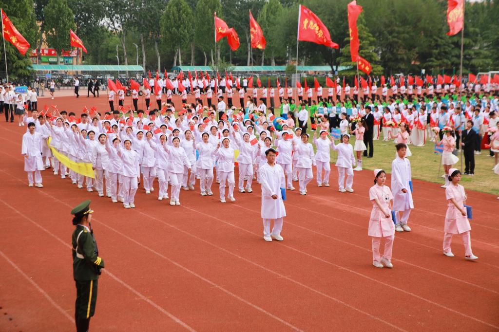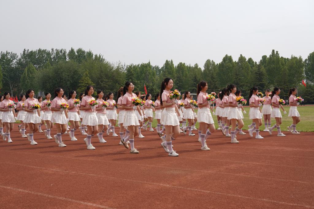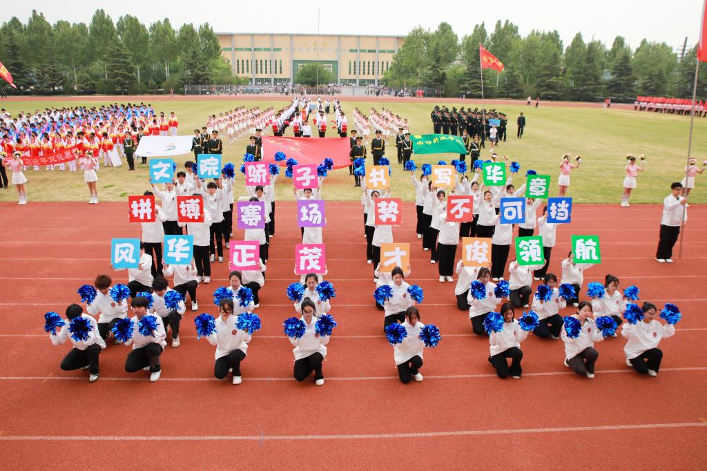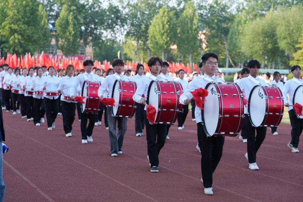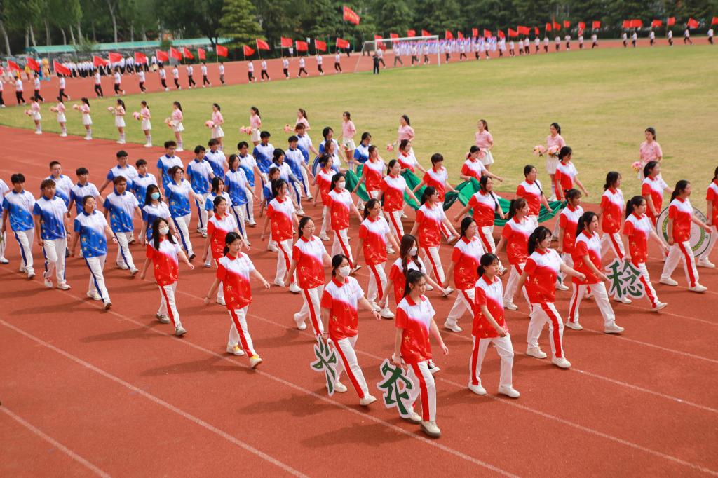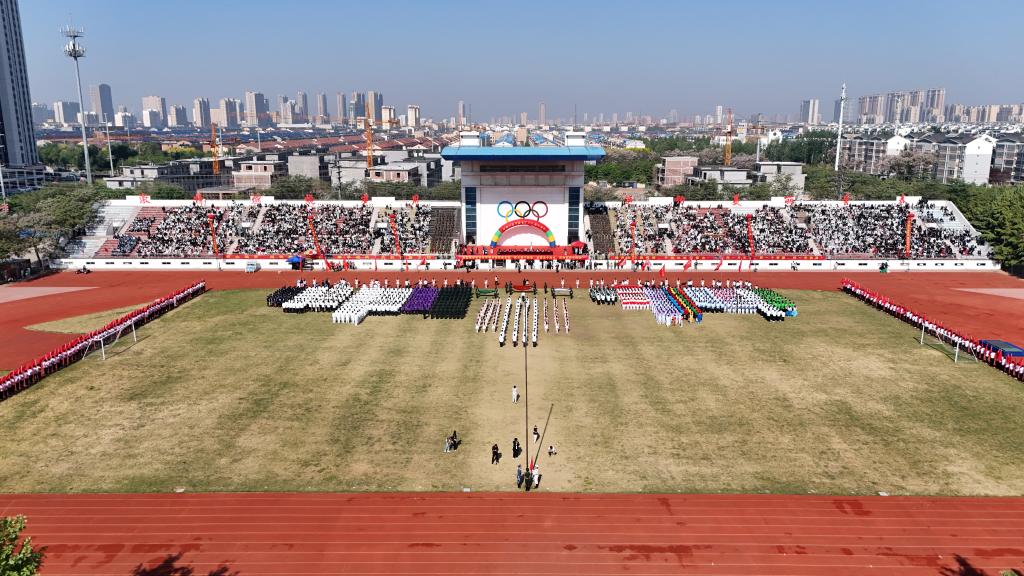 开幕式上还进行了精彩的团体操表演,参演学生统一着装、精神饱满,通过多样化的队形设计与创新编排,展现青春风采,彰显拼搏精神,赢得现场师生、嘉宾的阵阵掌声与喝彩。近年来,学校持续推动群众性体育活动,通过规范体育教学、构建‘课内外一体化’体能提升模式、鼓励师生参与体育竞赛等措施,切实贯彻‘每天锻炼一小时’健康理念,取得了显著成效。