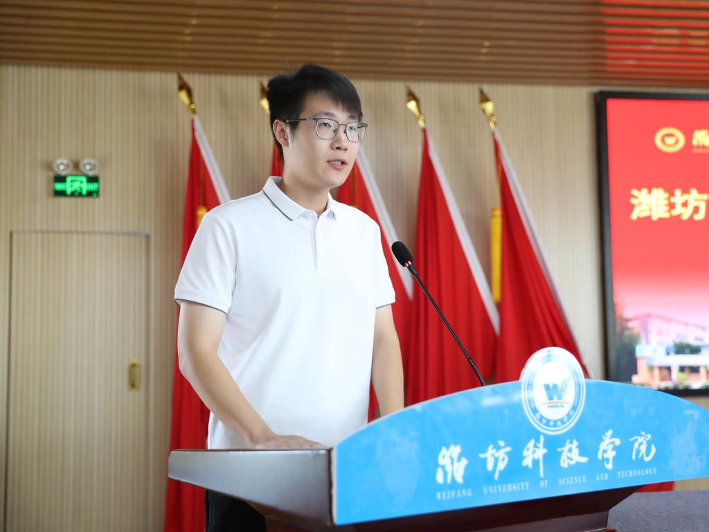 新教师代表张旭豪发言。他表示,非常感谢学校为新入职教师提供的成长机会,作为新入职教师会珍惜学校提供的学习资源和成长平台,以德立身、为人师表,潜心教学、教书育人,将扎根科研、服务社会,竭尽全力为学校高质量发展贡献力量。