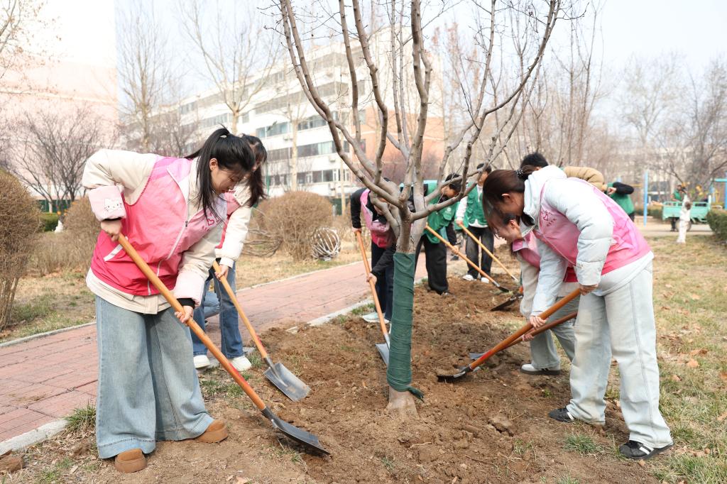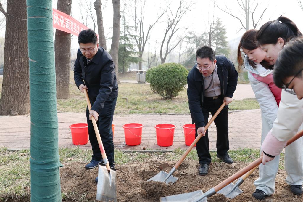 活动现场,师生们挥锹铲土、扶苗填坑、细心培土、浇水灌溉,大家齐心协力,干劲十足。一棵棵新绿在春风中挺立,焕发出勃勃生机。
