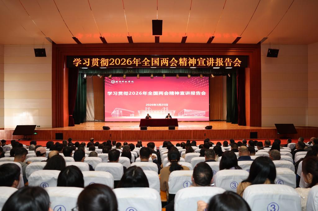 3月25日,潍坊科技学院召开学习贯彻2026年全国两会精神宣讲报告会,邀请第十四届全国人大代表、三级教授、学校设施蔬菜新质生产力研究院院长邹宁作专题宣讲。校领导付乐启主持会议并作总结讲话。校级领导班子成员,科长及以上干部,科研人员,全体辅导员、导师、班主任,组织员、学生党支部书记等共计1200余人参加。