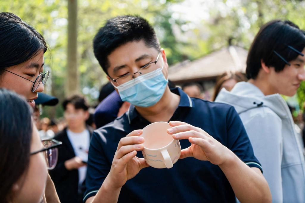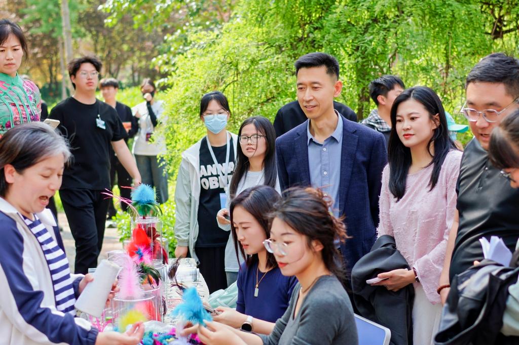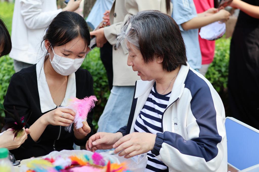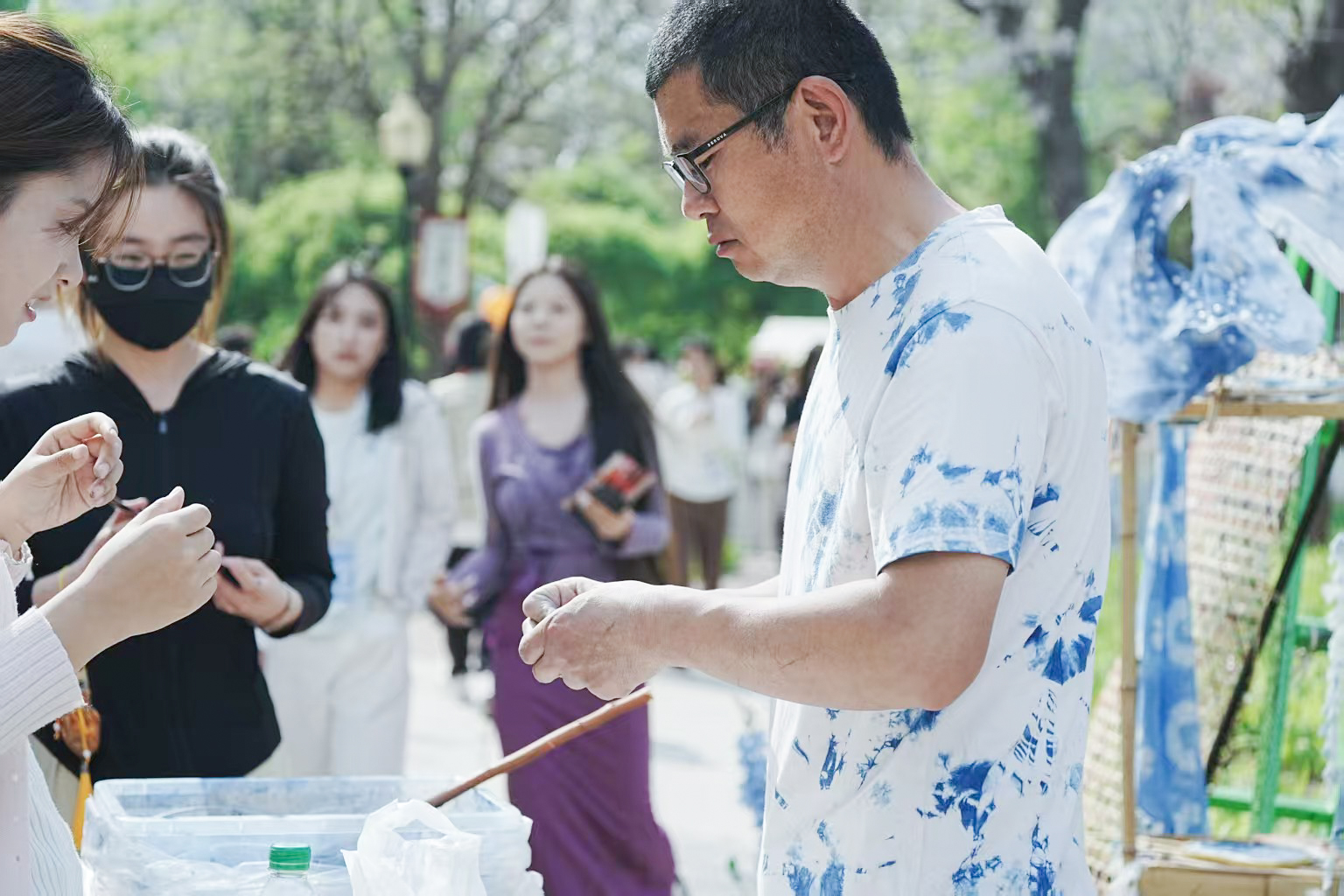 四月的桐园化作流动的锦绣华章,一步一景,满目国风。作为本次活动的核心板块,“非遗匠心展区”以“展示+教学+体验”一体化展位为特色,群星闪耀,精彩纷呈。国家级非物质文化遗产青州花毽传承人李红现场展示花毽绝技,轻盈灵巧的动作引来阵阵喝彩;寿光非遗蓝花布印染技艺代表性传承人董德强指导学生亲手体验扎染过程,感受布上生花的奇妙;紫金陶技艺传承人李继春、木雕艺人甄金强、手绘年画手艺人宁秀梅也纷纷亮出绝活,手把手教学,让同学们在动手实践中感悟传统技艺的文化积淀与创新价值,真正实现了文化体验的知识性与实践性深度融合。