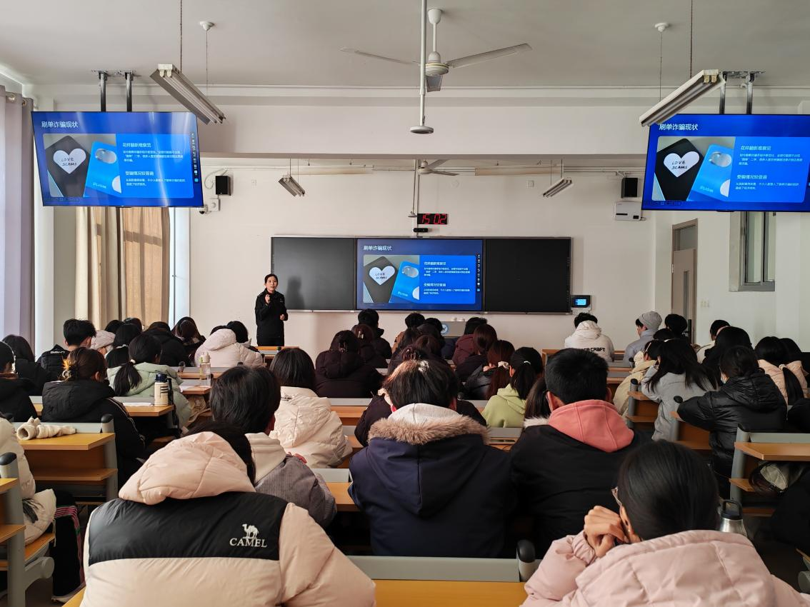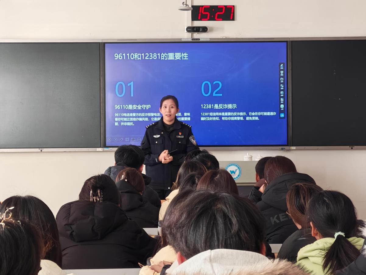 讲座中,吴欣彤结合自己一线工作的实践经验,首先系统讲解了当前电信网络诈骗的新型手段与防范要点,并围绕“识骗、防骗、拒骗”三大维度展开深入分享。随后,她聚焦校园高发诈骗类型,拆解作案特征,提醒同学们警惕各类虚假承诺,守护个人征信安全。接着,她详细解读了反诈预警机制,传授“三步辨别真假民警”的实用技巧,并强调坚决杜绝“预后转账”的风险行为。最后重点阐明出租、出售“两卡”的法律后果,提醒同学们要严守法律底线,切勿沦为电信网络诈骗的“工具人”与帮凶。