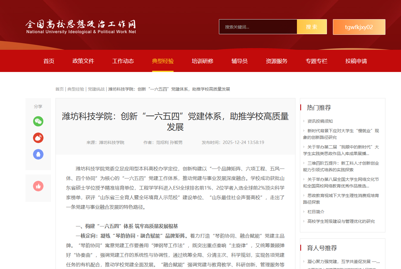 我校《创新“一六五四”党建工作体系,助推学校高质量发展》在全国高校思想政治工作网“典型经验”发表。全国高校思想政治工作网是教育部主管,教育部思政司指导的全国高校思政工作的资源集散库、思想文化策源地和宣传舆论风向标平台,是国内权威的高校思政工作宣传平台。截止到目前,我校已在思政网发表典型经验2篇,工作动态13篇。内容覆盖“高校”“院系”“支部”“党建统战”等多个类别,充分展现了学校在全国思想政治工作领域的组织力、创新力与影响力。
