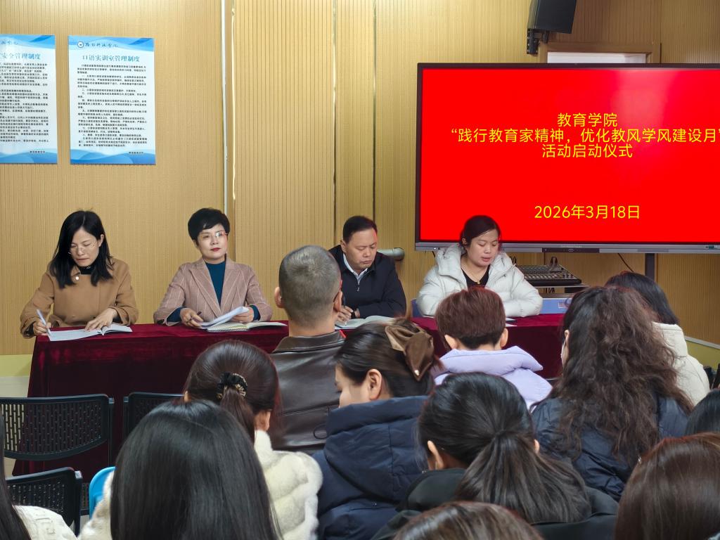 3月18日,教育学院举行“践行教育家精神,优化教风学风建设月”启动仪式。仪式由学院副院长黄登翠主持,学院科长及以上干部、全体专职教师、辅导员参加活动。
