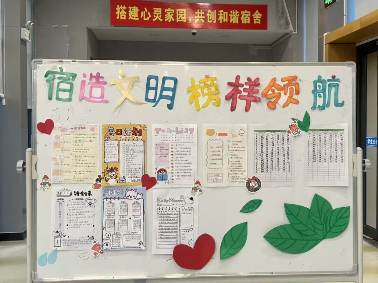 宿舍安全会议部署全面排查,严查用电消防隐患,筑牢安全住宿防线;舍长交流座谈倾听学生心声,树立文明意识,共建整洁友爱宿舍;宿舍文明画报创意呈现,以视觉语言传递公约准则,彰显文明内涵。趣味体育团建凝聚宿舍合力,舒缓学业压力,增进舍友默契;互助学习共研计划方法,营造优良学风,实现携手共进;剪纸艺术创作浸润寝室文化,传承匠心精神,营造温馨和谐氛围。