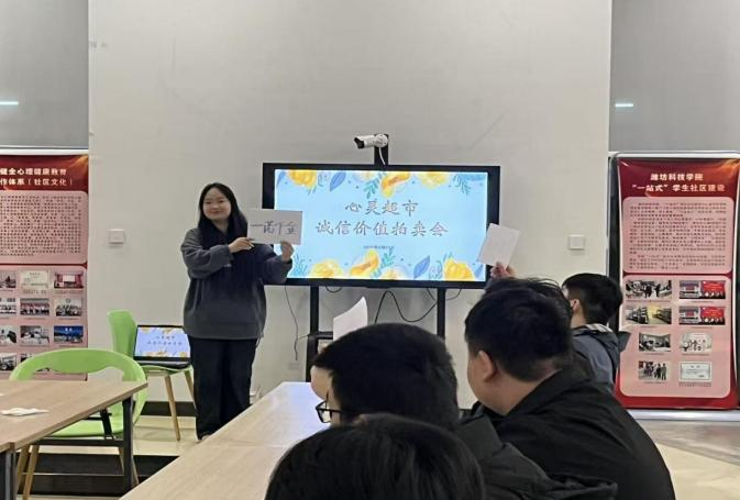为引导学生树立正确诚信观,学院开展“诚信之光,照我前行”主题班会。辅导员通过案例研讨、情景辩论、故事分享等形式,与学生深入探讨校园生活与人际交往中的诚信议题,引导学生主动思考诚信的重要性,明确诚信的核心意义,帮助学生筑牢诚信思想根基,树立遵信守诺的良好意识。“心灵超市”诚信价值拍卖会以“竞拍品格,感悟真谛”为核心,打破传统模式,将诚信、责任等品格特质转化为可“竞拍”的“拍品”。活动现场,学生们踊跃参与竞拍,每一次举牌都是对品格价值的认可,每一次抉择都是对诚信理念的践行。分享环节中,学生们结合自身经历畅谈诚信感悟,深刻领悟“人无信不立”的内涵,在思辨互动中提升精神素养。