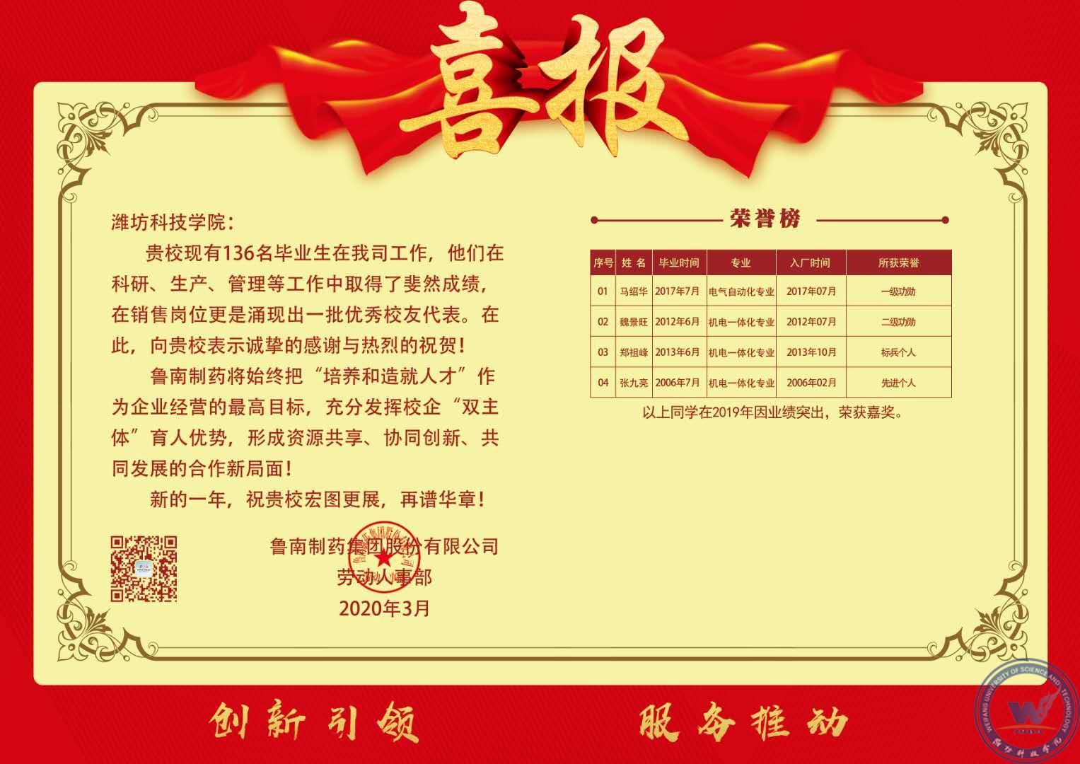 [本站讯]近日,我校电气自动化学院、工商管理学院等院系收到鲁南制药集团股份有限公司发来的喜报,2017届电气自动化专业毕业生马绍华、2012届机电一体化专业毕业生魏景旺、2013届机电一体化专业毕业生郑祖峰、2006届机电一体化专业毕业生张九亮,工商管理学院毕业生张恒、王进平、朱启征、秦立涛、杨玥,分别被评为2019年度公司“一级功勋”“ 二级功勋”“标兵个人”“先进个人”等荣誉称号。