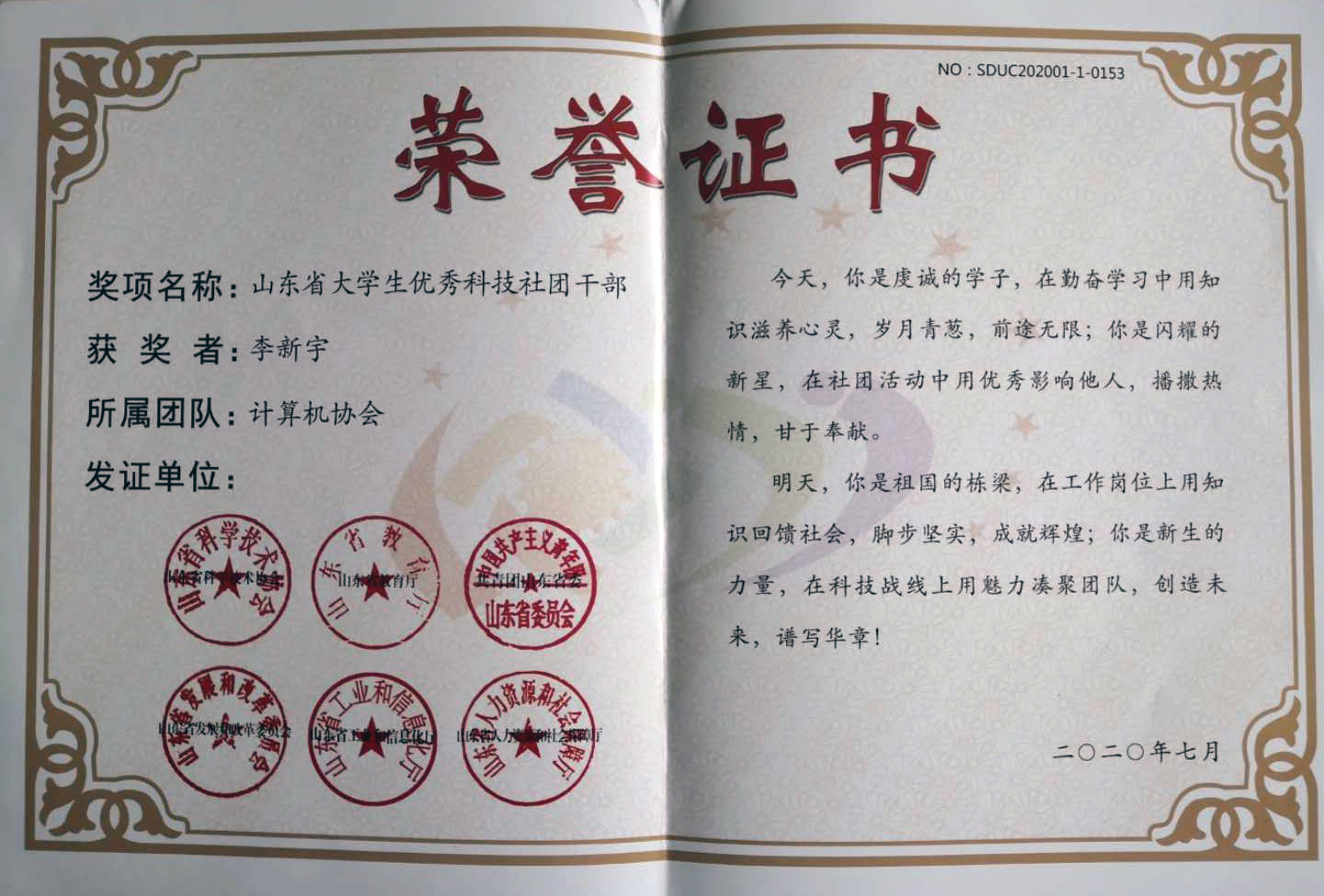 在山东省科协与山东省教育厅、共青团山东省委等多部门联合开展的2020年山东省大学生优秀科技社团和优秀科技社团干部评选活动中,计算机软件学院计算机协会社团被评为“2020年山东省大学生优秀科技社团”,李新宇同学被评为“2020年山东省大学生优秀科技社团干部”。
