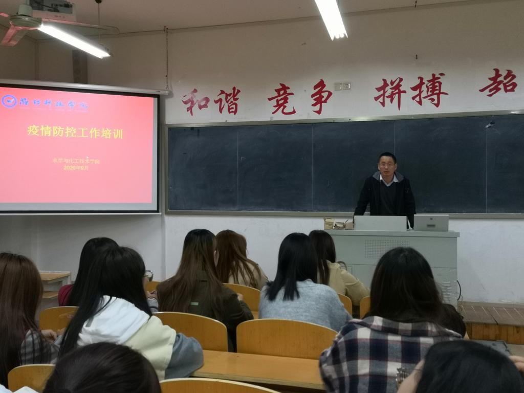 2020级新生入学至今,农学与化工技术学院党支部副书记李建永分批次为全体新生和学生会成员进行新冠肺炎疫情防控知识讲解。他强调日常学习和新冠肺炎疫情防控要两手抓,确保校园疫情零发生。此外,农学与化工技术学院全体辅导员、导师每周深入各班召开新冠肺炎疫情防控主题班会,提醒学生切实做好自我防护。