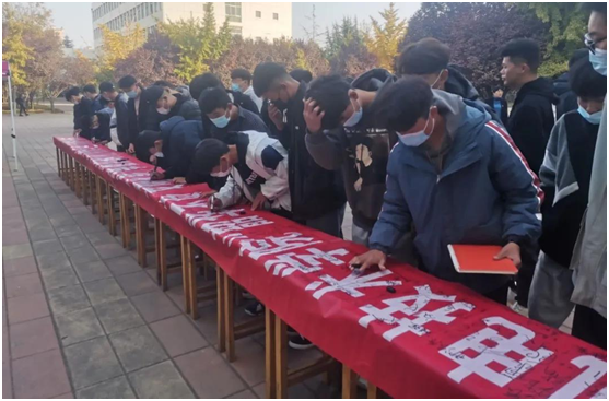 机电技术学院教师寇岩宣读“韶华不负、文明永驻”争做新时代文明大学生倡议书,呼吁全体学生营造文明和谐环境,共建文明和谐校园。机电技术学院全体师生在横幅上郑重签名表态,表达争做新时代文明大学生的决心。