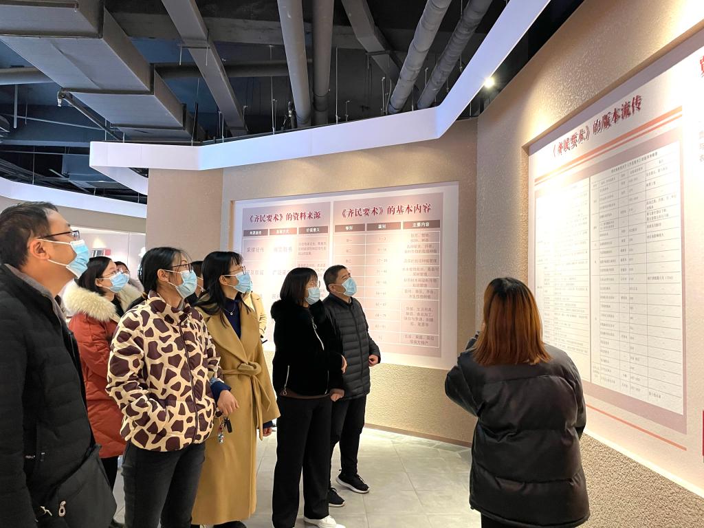 参观活动开始,老师们进入位于学术交流中心一楼的农圣文化展厅,由展厅的解说员向老师们讲解农圣文化的主体与内涵以及农圣贾思勰的农学思想体系与相关研究成果,介绍《齐民要术》的伟大成就和历史影响。参观期间,赵兴军院长与各位老师进行交流互动,阐述了农圣文化主体精神与当代社会主义核心价值体系的关系,强调传承创新农圣文化,对增强民族自信和文化自信,弘扬中华优秀传统文化,推动社会主义核心价值观教育有重要作用。