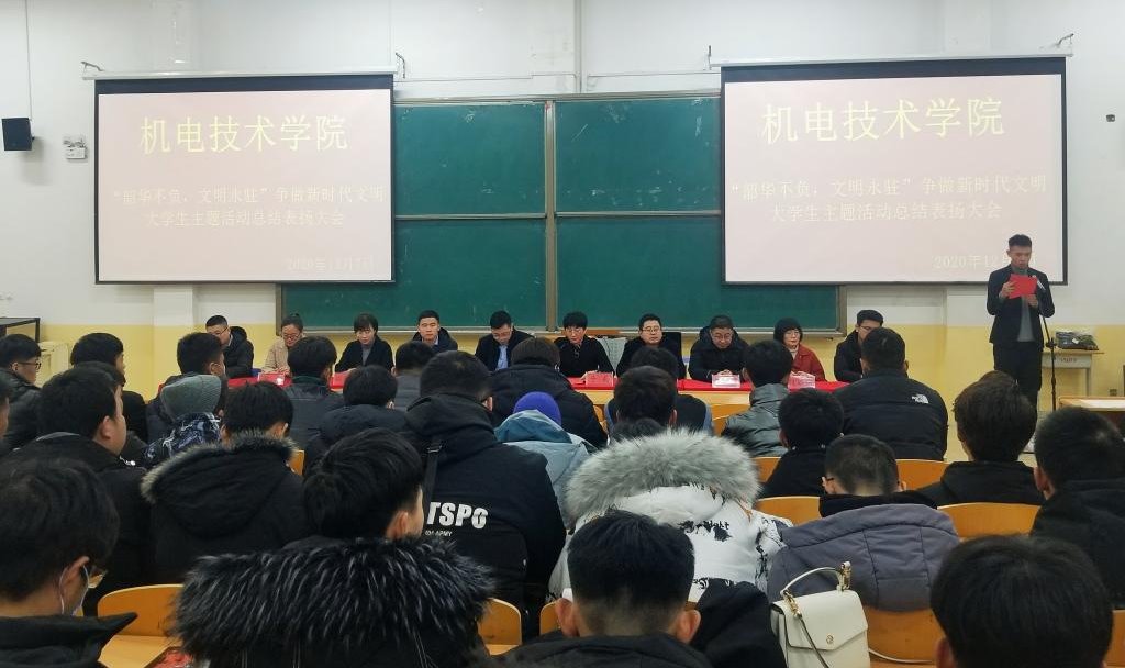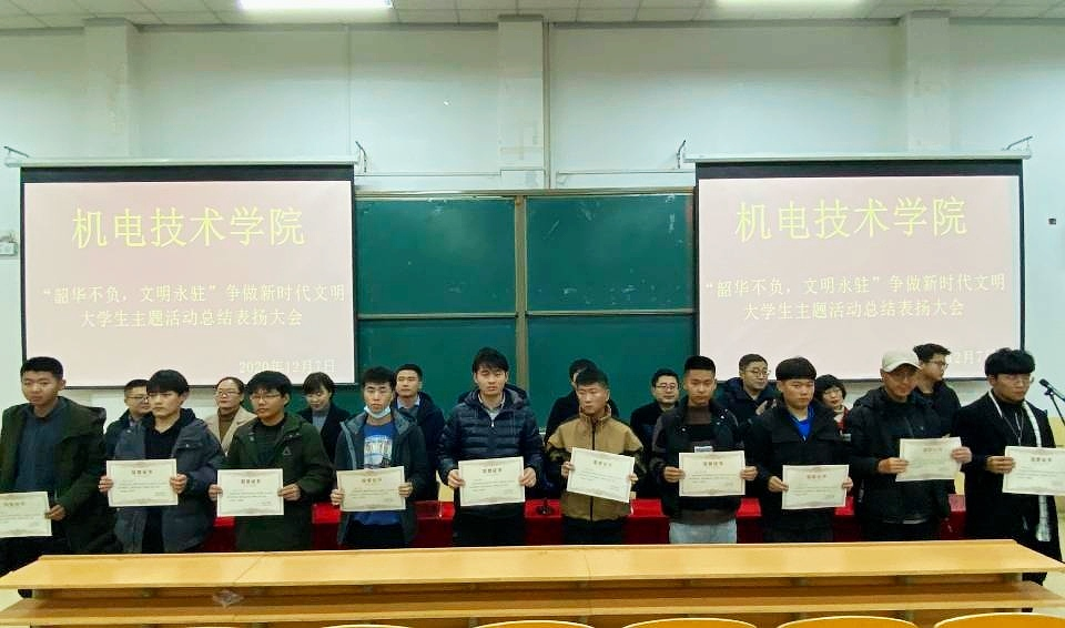 为贯彻落实学校“做新时代文明大学生”主题教育活动,总结活动成果,表彰活动中表现突出的个人和集体, 12月7日,机电技术学院举行“韶华不负,文明永驻,争做新时代文明大学生”系列活动总结暨表彰大会。机电技术学院党支部书记张培明、全体辅导员及学生代表参加,大会由党支部副书记于莉主持。